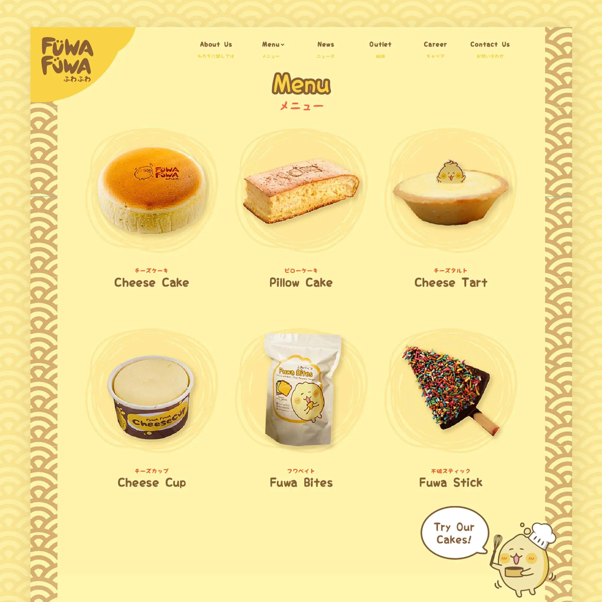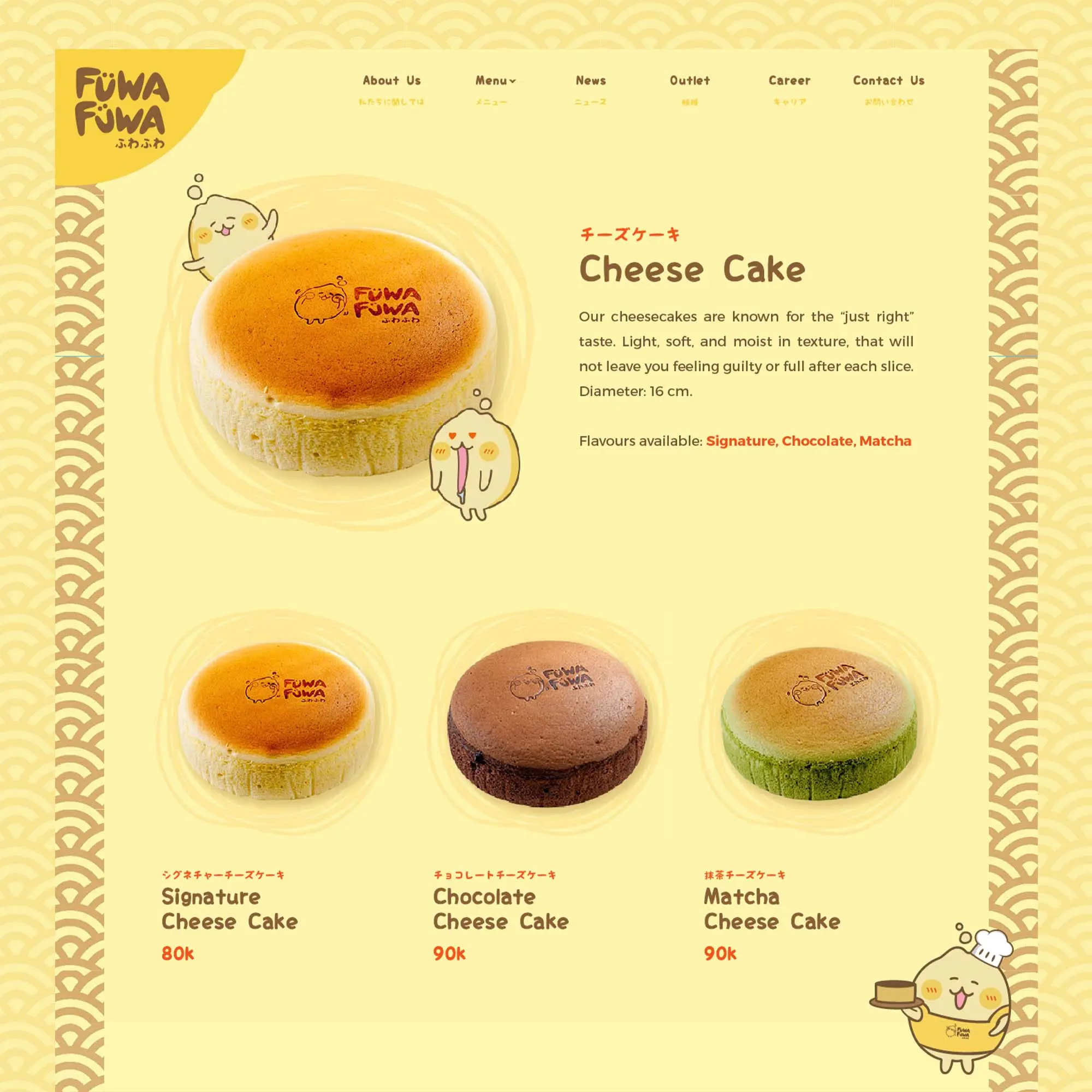 A digital branding website for Fuwa Fuwa World, a fluffy Japanese Cheesecake franchise. We are presenting a light, friendly and happy look fitting the concept of their brand. Also emphasizing on their cute mascot the FuwaChu on every pages!