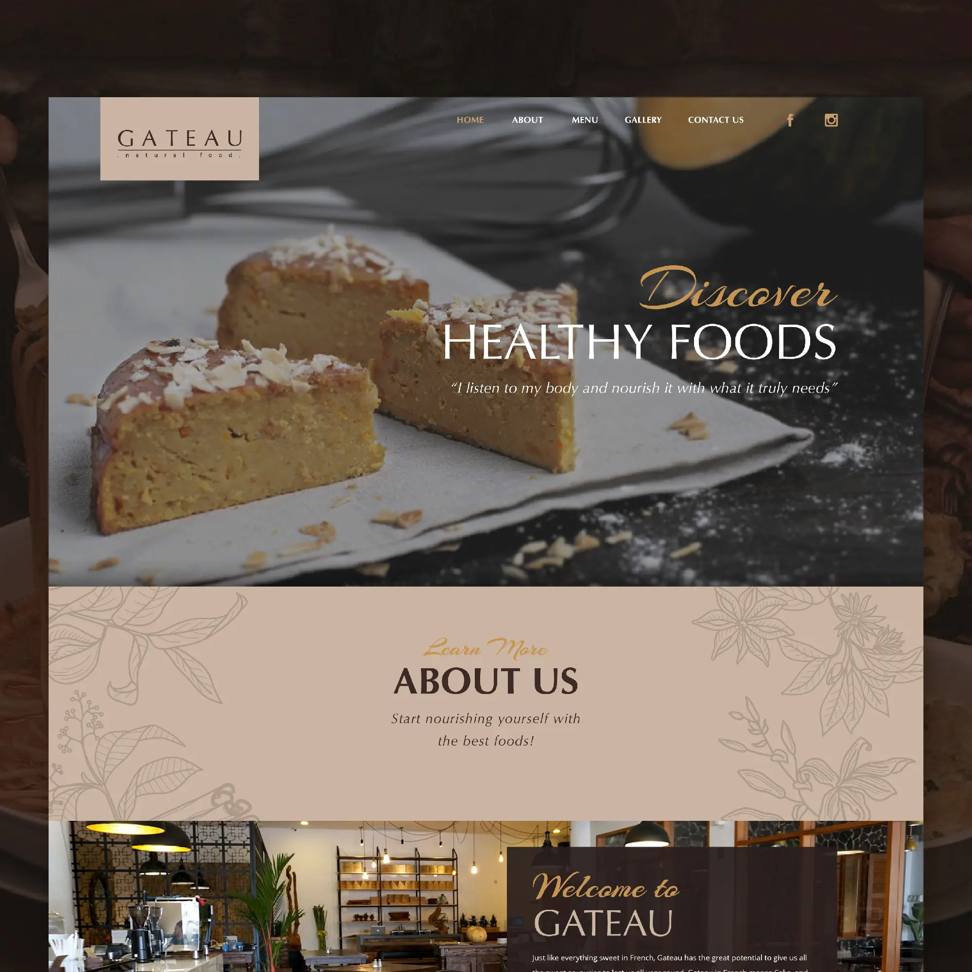 A digital branding website for GATEAU natural food, a healthy dining restaurant in Medan, Indonesia.